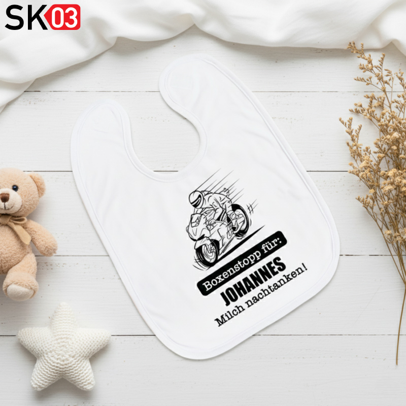 Das individuelle Babylätzchen Jungen mit Wunschnamen und Spruch „Boxenstopp für: [Wunschname] Milch nachtanken“ ist ein liebevolles Mitbringsel für neugeborene Jungen. Es kann aber auch genauso gut als Mitbringsel für kleine Babymädchen dienen. Für die Eingabe des Wunschnamen hast Du 10 Zeichen zur Verfügung. Als persönliches Geschenk zur Geburt, Taufe und Babygeburtstag für den Nachwuchs eignet es sich ideal für Eltern die Motorradfahrer sind. Die zauberhafte, personalisierte Geschenkidee mit tollem Mottospruch für den täglichen Gebrauch kommt auch bei den Großeltern, Uroma und Uropa gut an. Auch die Patentante oder Patenonkel werden begeistert sein. Der Kleckerlatz zeichnet sich durch eine weiche Frotteerückseite aus. Zusätzlich ist die weiche Vorderseite noch mit einem weichem Saum eingefasst. Ein praktischer Klettverschluss zum einfachen, schnellen Öffnen und Schließen rundet dieses praktische Lätzchen ab. Zudem ist das Geburtslätzchen nachhaltig und langlebig, da es immer wieder mit einer Maschinenwäsche waschbar ist.
