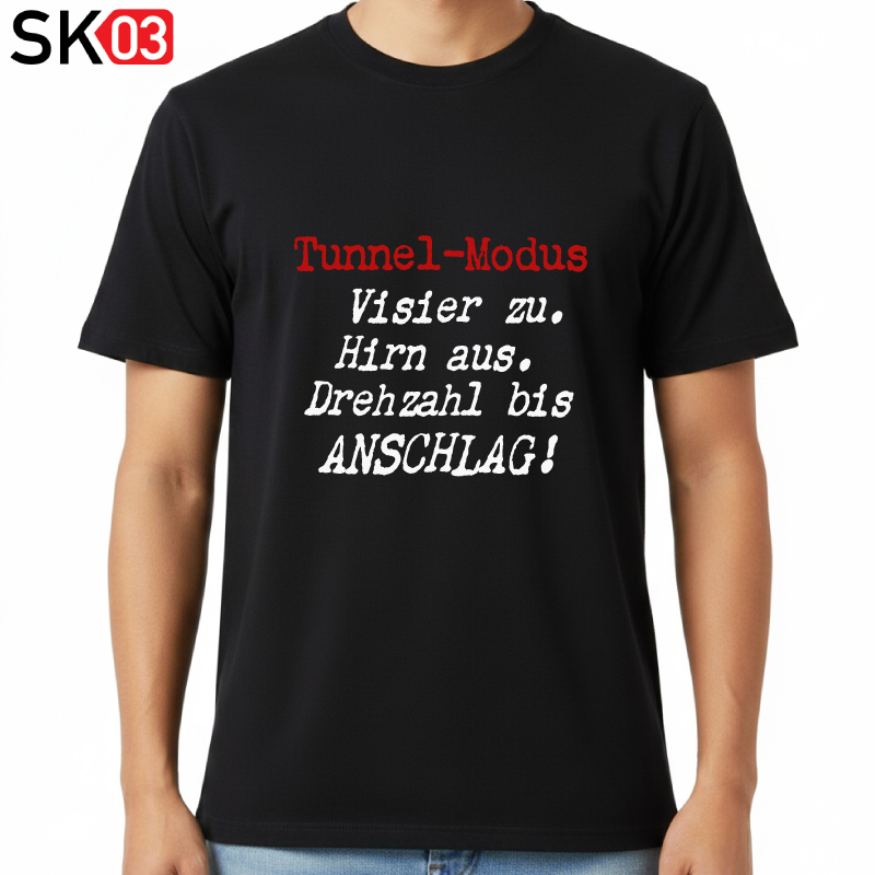 Mit diesem Motorrad-T-Shirt hast Du die Blicke garantiert auf Deiner Seite! Ein absoluter Hingucker und ein Lacher unter Motorrad-Fans. Perfekt, um deine Leidenschaft für schnelle Motorräder und puren Fahrspaß zu zeigen. Die Botschaft ist klar: Tunnel Modus Visier zu. Hirn aus. Drehzahl bis Anschlag! Die Farbe der Überschrift ist individuell auswahlbar. Es stehen die Farben weiß, schwarz, apfelgrün, neongelb, neonorange, pink, gold, rot, hellblau, ränge und silber zur Auswahl. Das Shirt ist erhältlich in klassischem Schwarz und vielen Größen. Die Damenvariante ist tailliert geschnitten, die Herrenversion angenehm gerade, perfekt für jeden Tragekomfort. Das ideale Präsent für jeden Motorradfahrer, Biker oder Töff-Fahrer zum Geburtstag, zu Weihnachten oder einfach als coole Überraschung. Dieses Mottoshirt sorgt garantiert für Gesprächsstoff und bleibt lange in Erinnerung. Gefertigt ist das Kurzarm Shirt aus weicher Baumwolle, das auch unter der Motorradjacke angenehm sitzt. Der markante Aufdruck ist robust und hält vielen Fahrten und Wäschen stand.
