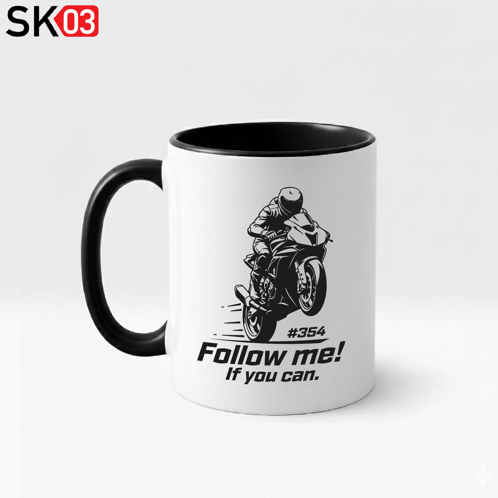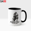 Tasse Motorrad Startnummer Wheelie Motiv mit Rennstreckenfahrer Spruch Follow me! If you can.